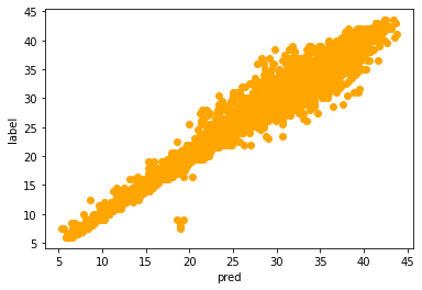 test data(10000개)에 대해서 예측 값과 정답 값을 Scatter plot을 이용하여 나타낸 값이다. 튀는 값이 조금 있지만 대체적으로 선형 그래프를 나타내며 학습이 잘 된 것 같다. (사실 10분 뒤의 결과를 예측하는 것이라 어렵지 않은 task다.)