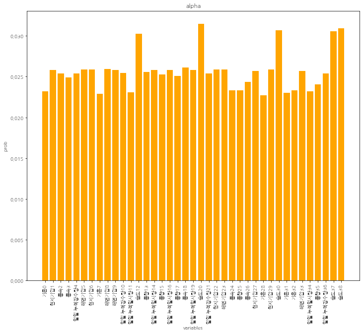 Encoder에서 각 변수들에 대한 중요도를 계산한 Alpha(encoder attention weights)를 그래프로 표현하면 아래와 같다. 대부분 비슷한 중요도를 가지는 것으로 나타난다. 그 중에서도 습도에 대한 변수들이 높은 attention value를 가지는 것을 볼 수 있다. 기온과 관련한 값들이 높을 것으로 예상하였지만 다른 결과가 나왔다.