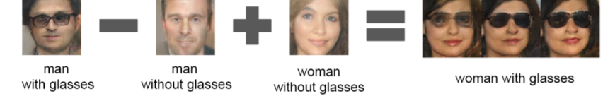 자연어처리에서 단어의 임베딩이 잘 되었을 경우 King - Man + Woman를 계산하면 Queen이 나오게 된다. 그런데 신기하게 생성 모델에서도 Z값을 통한 연산으로 이런 결과가 나온다는 것이 논문에 실려있다. 예를 들면 아래와 같은 결과이다.