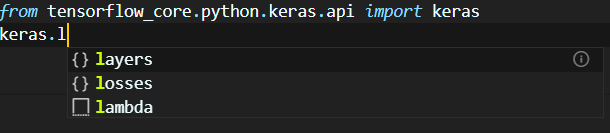 그런데, tensorflow의 keras를 이용하려고 하는데 intellicode가 아래의 사진처럼 잘 안되는 걸 느꼈습니다.