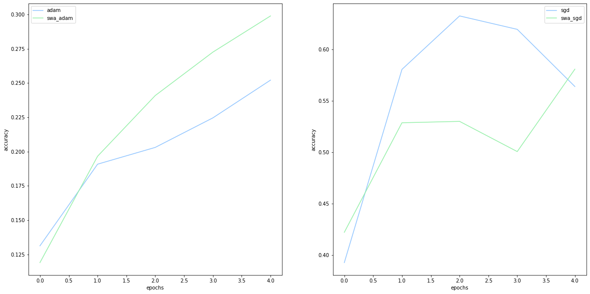 test set에 대한 결과는 adam:0.21, swa_adam:0.26, sgd:0.53, swa_sgd:0.56 이었다. 여러 번 실행을 하였을 때 SGD의 경우 swa가 더 잘 나오는 결과를 얻었다. 하지만 Adam은 training마다 결과가 잘 나올 때도 있고 그렇지 않을 때도 있었다. learning rate을 너무 크게 설정해서 그럴 수도 있다.