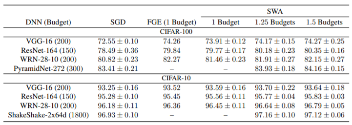 3) 기존의 알고리즘들과 SWA를 ImageNet이나 CIFAR-10, CIFAR-100에 적용하여 성능을 비교하였는데 기존 SGD보다 항상 좋은 성능을 냈다.