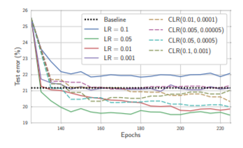 2) 이어서 Preactivation ResNet-164로 CIFAR-100를 학습할 때, 여러 Learning rate scheduels로 실험을 했다. 결과는 아래와 같다.