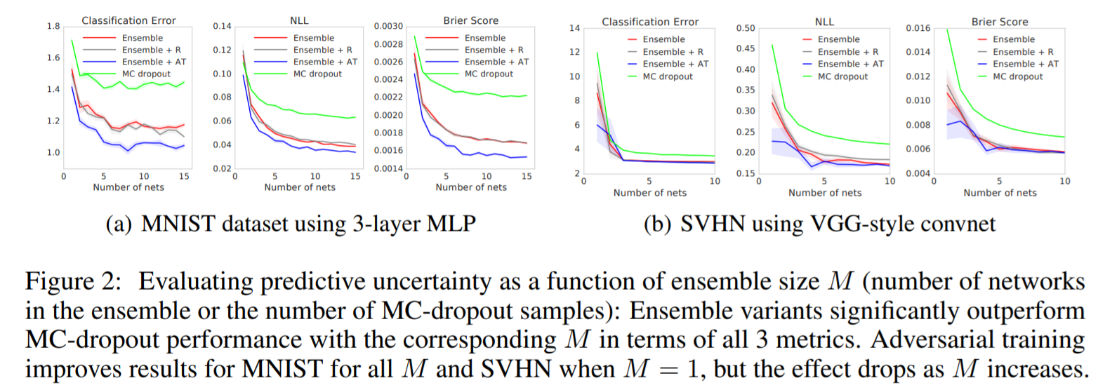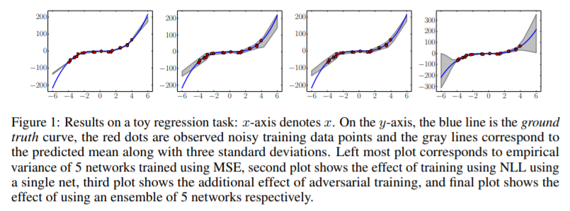 첫 번째 plot은 MSE로 훈련한 결과로 Uncertainty를 전혀 나타내지 못한다. 두 번째 plot은 1개의 모델을 NLL로 훈련한 결과로 약간의 variance를 나타내기 시작했다. 세 번째는 adversarial training을 추가한 결과로 그렇게 나은 성능을 보이진 않는 것 같다. 마지막은 5개의 모델을 앙상블 한 결과로 넓은 variance로 uncertainty를 추정하여 실제 분포를 추정해냈다. 이 실험으로 Ensemble과 Scoring rule(NLL)을 사용하는 것이 Uncertainty 추정에 좋다는 것을 알 수 있다.