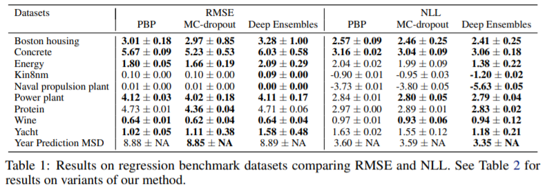 RMSE를 사용하여 학습시키는 경우 논문에서 제시한 Deep Ensembles방법이 그다지 좋지 못하다. 하지만 NLL을 사용하면 대부분 더 좋은 결과를 얻음을 알 수 있다.