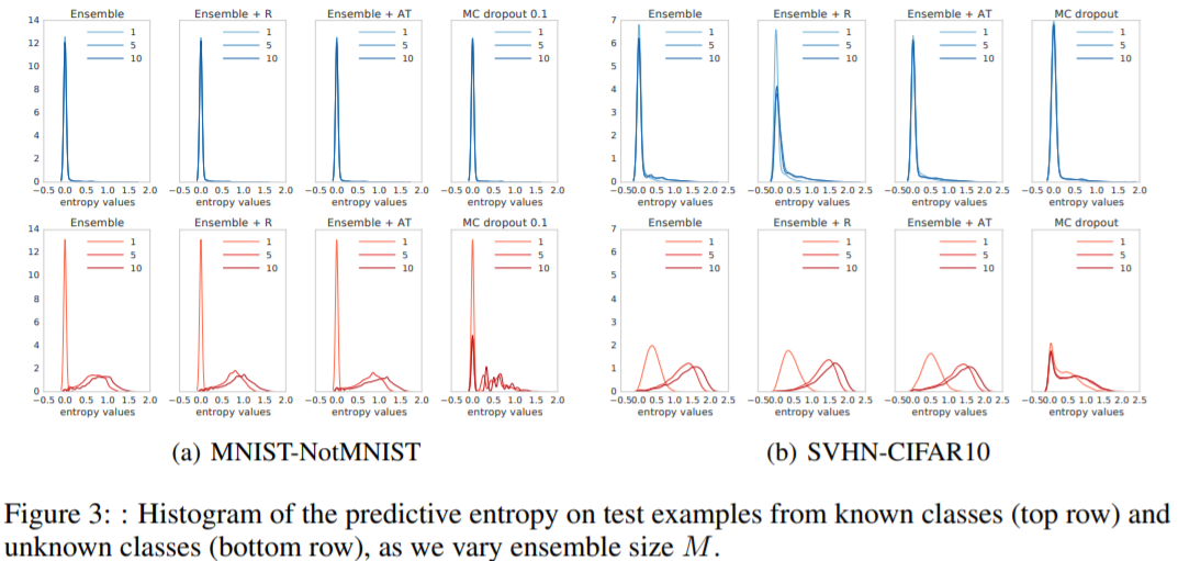 Entropy values로 측정을 하였는데 이 값이 높을수록 uncertainty 추정을 잘한 것이다. Known class(위의 그래프)에 대해서는 모든 모델이 좋은 성능을 보이고 있다. Unknwon class(아래의 그래프)는 Ensemble이 1개인 경우 entropy values가 낮지만 5개 이상의 ensemble 결과는 잘 나옴을 알 수 있다. 반면 MC-dropout은 uncertainty 추정이 Deep-Ensemble 모델보다 좋지 못하다.