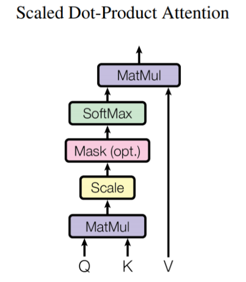 이제, Scaled Dot-Product Attention을 이해해보자. 스케일 내적 어텐션의 구조는 아래의 그림과 같다. 전체적인 개념은 앞에서 본 셀프 어텐션과 거의 동일하다.