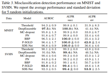 Misclassification detection 결과는 DeepEnsemble이 좋다. 하지만 SDE-Net과 별로 차이가 나지 않는 반면 computational cost는 높기 때문에 SDE-Net을 사용하는 것이 더 좋은 선택이 될 수 있다.