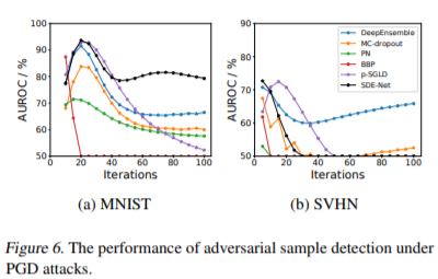 PGD방법에 대한 결과는 figure 6에 나와있다. MNIST의 경우 SDE-Net이 가장 outperform 한 결과를 내보였다. 하지만 SVHN은 DeepEnsemble을 제외한 나머지는 굉장히 좋지 못한 결과를 보였다. 이는 SVHN의 manifold가 high dimension을 가져 그럴 가능성이 높다고 한다. 그래서 이를 효율적이고 robust 하게 개선하는 것이 further work라고 소개한다.