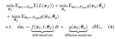 Diffusion Net g는 epistemice uncertainty를 구하는 것에 목표를 둔다. In-distribution(ID) data는 Brownian motion의 variance가 작아야 한다. 그래서 system state가 drift term에 의해 결정되며 output variance가 작아야 한다. 반면 Out-of-distribution(OOD) data는 Brownian motion의 variance가 커야 하며 system이 chaotic 해야 한다. 학습을 할 때 binary cross entropy error를 사용하여 fake(OOD)와 true(ID)를 잘 구별하도록 학습시킨다.