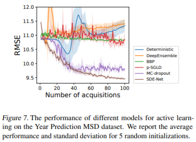 예상대로 SDE-Net이 굉장히 좋은 결과를 내고 있다. uncertainty에 대한 측정이 좋았기 때문에 informative data를 잘 뽑아낸 것이다. 예상외로 MC-dropout도 상당히 좋은 결과를 얻었다. 반면 DeepEnsemble방법은 좋지 못한 결과를 내었다.
