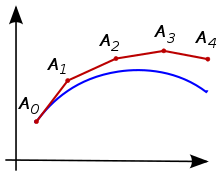 EX) 아래의 그림과 같이 A0가 시작점(초기값)이라고 가정하여 구해본다. A0에서의 기울기와 $\Delta t$를 곱하여 A0에 더하면 A1의 점을 구할 수 있다. 그렇게 구한 점도 곡선 위에 있다고 가정하고 같은 과정을 반복하면 A4까지 구할 수 있게 된다.