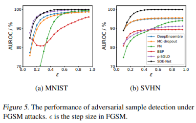 DNN은 데이터에 작은 adversarial perturbations를 준 adversarial examples에 굉장히 취약하다. 그래서 adversarial samples를 잘 detect 하는 것이 중요하다. SDE-Net은 따로 adversarial training을 하지는 않았지만 실험을 하였다. 여기서는 Fast Gradient-Sign Method(FGSM)과 Projected Gradient Descent(PGD) 방법으로 실험하였다.