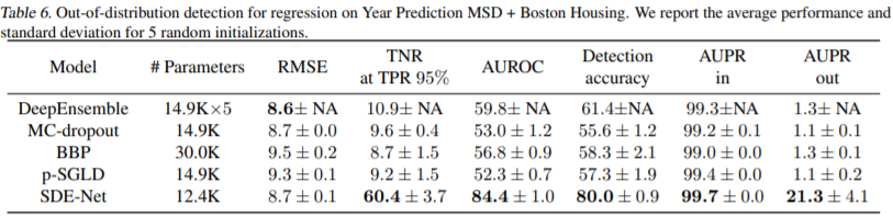 Regression은 Year prediction MSD 데이터에 대해 학습하고 Boston Housing 데이터 셋을 OOD 데이터로 넣었다. 다른 모델들은 OOD 데이터에 정말 취약한 모습으로 보인다. 기본적으로 regression task는 연속적이고 한이 없기 때문에 uncertainty를 알아내기 굉장히 어렵기 때문이다. 하지만 SDE-Net은 상당히 좋은 결과를 내었다. diffusion net이 input data와 OOD데이터를 통해 직접적으로 학습하기 때문에 좋은 성능을 낸 것으로 보인다.