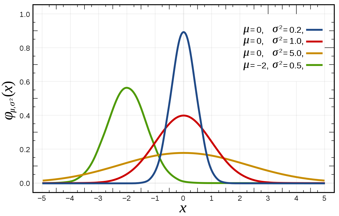 $$ N(\mu, \sigma) = \frac {1} {\sqrt {2\pi \sigma^{2}}} e^{\frac {-(x-\mu)^{2}} {2 \sigma^{2}}} \cdots (1)$$