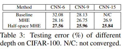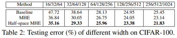흥미로운 실험들만 남겨둔다. Table2는 width가 커질 때 각 알고리즘 결과이고 Table3은 depth가 커질 때 결과이다. MHE를 썼을 때 Baseline 보다 network size가 작음에도 (width, depth 모두) 더 좋은 성능을 보이는 경우가 많았다.