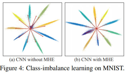 서로 다른 classifier neuron에 대해서도 hyperspherical margin이 maximize 되도록 학습되어서 Class Imbalance 문제에서도 잘 작동했다. Figure4는 MNIST 데이터에서 0에 해당하는 데이터를 98% 날리고 학습시켰을 때 결과다. (화살표는 classifier neuron이고 각 색에 해당하는 것은 숫자다)