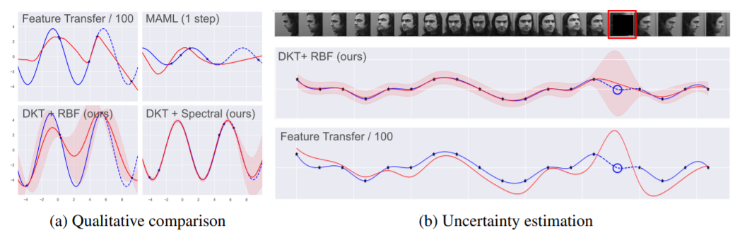meta learning 논문 실험에 자주 등장하는 sin 곡선에 대한 실험과 head trajectry estimation 실험이다. Deep Kernel Transfer (DKT)가 이 논문에서 제시한 방법의 결과다. (a) 결과를 보면 상당히 잘 맞춘 결과를 볼 수 있다. 다만 RBF kernel는 smooth 하지만 fitting이 잘 되어 있지는 않은 반면 Spectral kernel은 잘 맞췄다. 사실 Spectral kernel 자체가 cos term이 들어가기 때문에 주기 함수를 맞추는데 유리하기 때문인 것 같다. 반면 (b)는 RBF로 괜찮은 성능을 보인다. gp 특성상 uncertainty까지 보여주니 상당히 좋아 보인다.