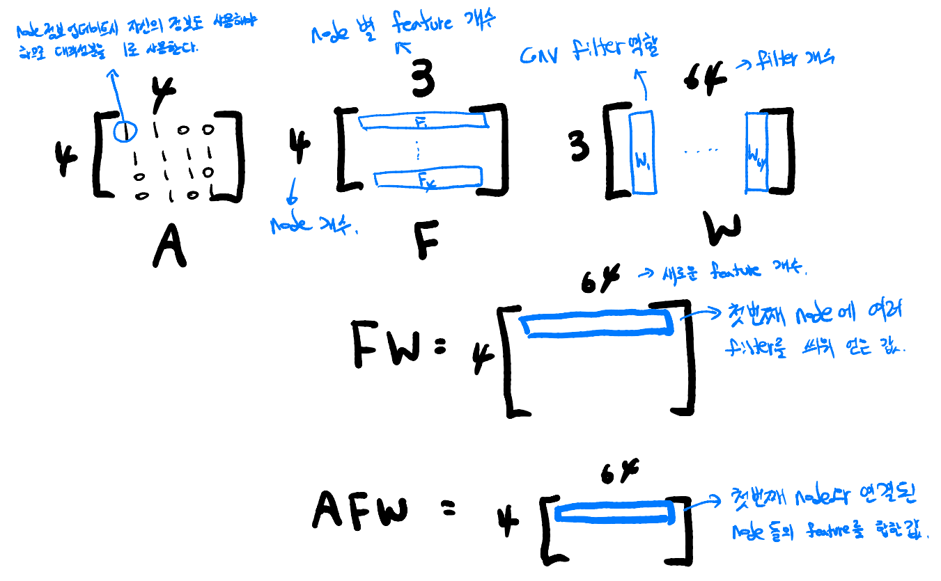 이런 특성을 가져와 figure 3 (b)처럼 그래프에서도 주변 node의 정보를 spatial 하게 얻어 정보를 업데이트하는 방법을 고안한 것이 graph convolution network다. Figure 1의 경우에 대입해서 생각해보면 2번 node를 업데이트할 때는 1,3,4 node를 사용하지만 다른 node는 2번 node만을 사용하는 것이다. (실제로는 자기 자신의 정보도 중요하므로 자신의 정보도 함께 사용하여 업데이트한다. 즉 adjacency matrix의 대각 성분은 1이 된다.) 실제 연산은 $AFW$ matrix 연산으로 이루어진다. A는 adjacency matrix이며 F는 feature matrix, W는 weight matrix이다.