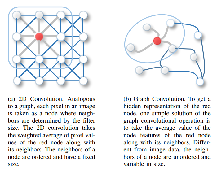 Graph structure를 matrix로 표현하는 방법을 간단히 알아보았다. Graph는 edge가 node 간의 연결을 이루는 구조이므로 edge로 연결된 node끼리의 정보 교환이 중요하다 할 수 있다. 예를 들어 social graph의 경우 서로 연결된 가족이라면 비슷한 정보를 가지고 있을 수 있고 어떤 예측을 하는데 서로 도움이 될 수 있다. 이를 위해 graph structure를 고려하여 연산을 하는 방법이 필요한데 그중 하나가 convolution을 이용한 방법이다. Figure 3 (a)를 보면 정배열된 node 간의 정보를 spatial 하게 얻어서 사용하는 방법이 convolution이고 이런 특성 때문에 Image 계열에서 많이 사용된다. 대표적인 특징으로 3가지가 있다.