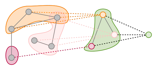 한편 graph pooling은 edge나 node의 정보를 서로 전달하고자 할 때도 사용할 수 있다([2]). Social graph를 예로 들어 보겠다. 각각의 사람들에 대한 정보가 node에 담겨 있고 edge로 node가 연결되어 있다고 할 때, 사람들의 정보를 보고 관계가 좋은지 나쁜지 binary classification (edge prediction)을 하고 싶다고 해보겠다. 이때 pooling을 이용하여 다음의 단계로 prediction을 수행할 수 있다.