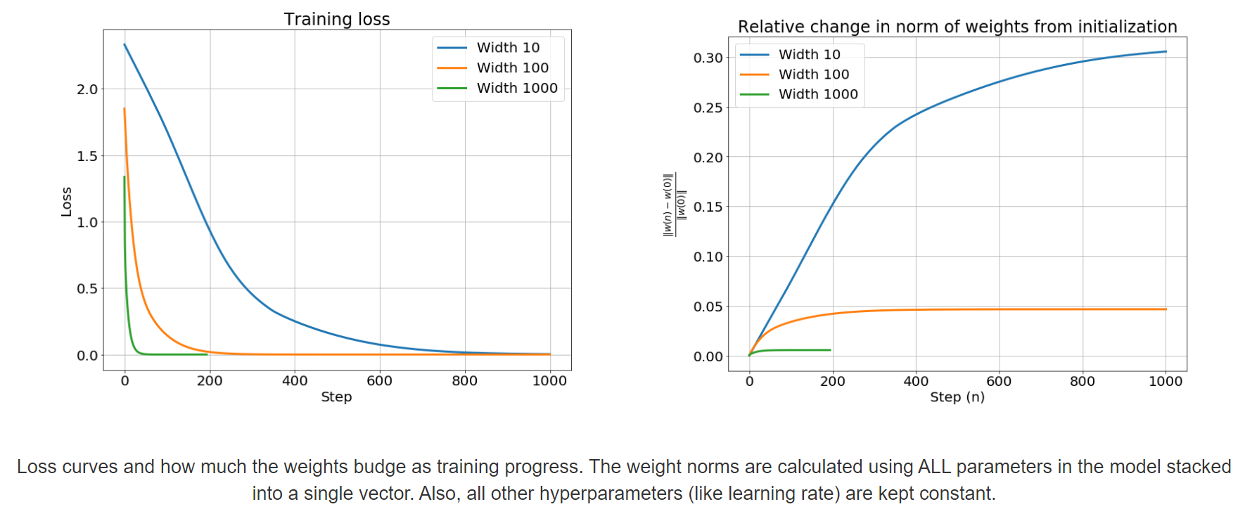 왼쪽 그림의 x축은 업데이트 횟수이고 y축은 training loss이며 width가 다를 때 어떻게 변화하는지 보여줍니다. Width가 클수록 적은 step만으로 training loss가 빠르게 작아짐을 볼 수 있습니다. 오른쪽 그림의 y축은 $ w_{0} $로부터 n번 update 한 parameter $ w_{n} $까지의 거리를 나타냅니다. Width가 클수록 움직인 거리가 작아짐을 볼 수 있습니다.