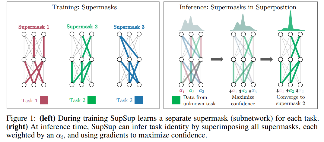 Super mask는 initial network만으로 좋은 성능을 내도록 만들어 준다는 강력한 특징을 가진다. 이를 이용하여 Supermasks in Superposition([2])에서는 continual learning에 적용한다. 기본이 되는 initial base network가 있고 supermasks를 implicitly 저장하고 있는 hopfield network가 있다. Hopfield network는 새로운 task가 주어졌을 때 output entropy가 작은 mask를 찾아준다. Mask를 이용한 다른 continual learning 방법으로 Pack-Net([6])이 있다.
