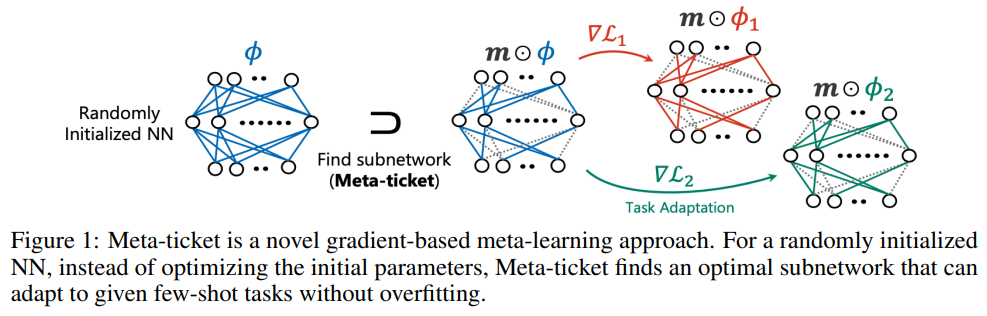 한편 Meta-ticket([8])에서는 기존 MAML 방식에서 mask를 사용하는 방법을 도입하여 meta-learning을 수행한다. Randomly intialized neural network에서 각 task별 mask를 만들어 sub-network(ticket)을 찾는 방식이다. 기본 MAML 보다는 잘 되지만, 2022년 논문임을 감안하면 성능이 엄청 좋진 않은 듯하다.
