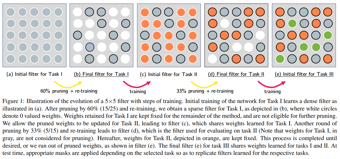 Package network를 나타내는 말로 여러 task를 network 하나에 packaging 한다는 의미다. 학습 방법은 간단한데, 특정 task를 훈련한 모델에서 중요하지 않은(magnitude가 작은) parameter를 pruning 하고 재학습한 후, new task를 학습시켜가는 방식이다. 이렇게 되면 old task, new task를 어느 정도 잘 맞출 수 있게 된다. 이 아이디어로 transfer learning에 적용한 PAC-net: a model pruning approach to inductive transfer learning([7])도 있다. 논문의 제목처럼 pretrained data에서 배운 prior knowledge를 유지하며 transfer learning 하려고 할 때 좋은 성능을 낸다.