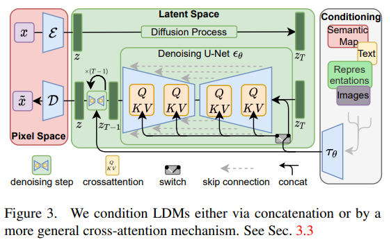 이를 극복한 것이 stable diffusion이다. Stable diffusion 모델의 알고리즘은 간단하다. 미리 auto encoder를 학습시키고 encoder를 사용하여 image를 압축시킨 후에 diffusion과 denoising을 하겠다는 것이 핵심이다. 이렇게 하면 computational cost가 훨씬 줄어드는 장점이 있을 뿐 아니라, Fig 6에서처럼 condition을 쉽게 latent에 추가하여 넣어줄 수 있다. (Condition으로 text를 넣어줄 때 위에서 봤던 CLIP과 같은 알고리즘 모델의 text encoder를 사용하면 더 좋은 성능을 보인다고 한다.)