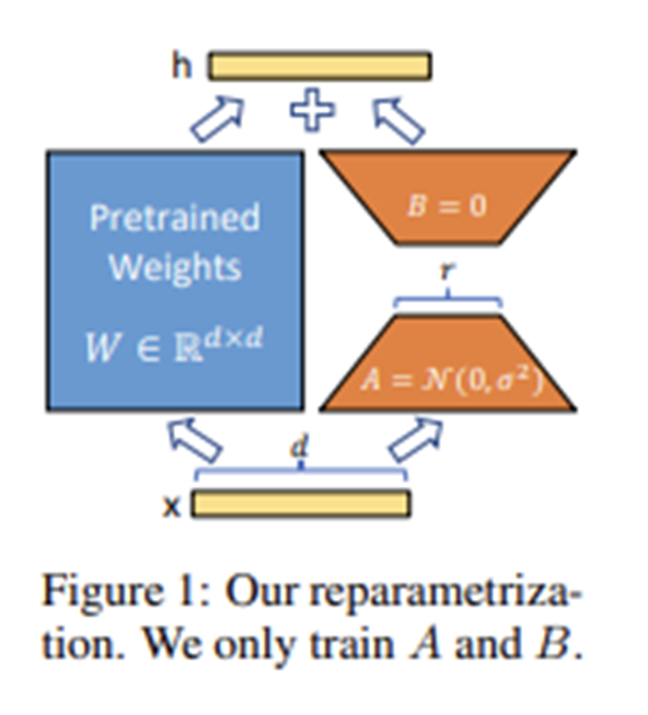이에 영감을 받아 LoRA가 만들어진다. 작은 차원의 파라미터만 사용해서 tuning 해도 충분히 좋은 finetuning 성능이 나온다는 것을 이용하여, Fig 11과 같이 matrix A와 B를 사용하여 훈련하겠다는 것이다.