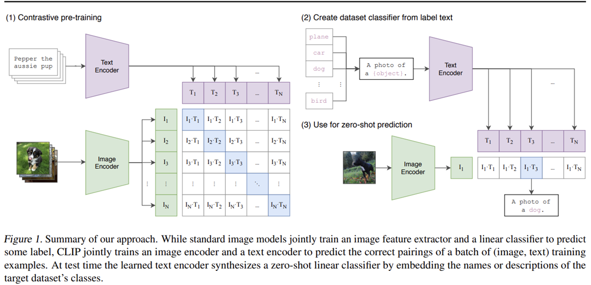 먼저 온라인에 있는 사진과 사진에 대한 caption에 대한 정보를 함께 가져온다. 그리고 Image의 feature를 뽑는 모델과(Image Encoder) caption에 대한 feature를 뽑는 모델(Text Encoder)을 만든다. 각 모델에서 나온 feature는 Fig 4의 (1)의 그림처럼 각각 inner product 해준다. Contrastive learning처럼 같은 정보(image에 대응하는 caption, $I_{i} T_{i}$, 파란색 칸) 끼리는 maximize 하되 다른 정보(하얀색 칸)는 minimize 하도록 학습시키는 방식이다. 이러한 알고리즘은 이미 잘 동작하는 것이 많이 알려져 있기 때문에 좋은 아이디어인 듯하다.