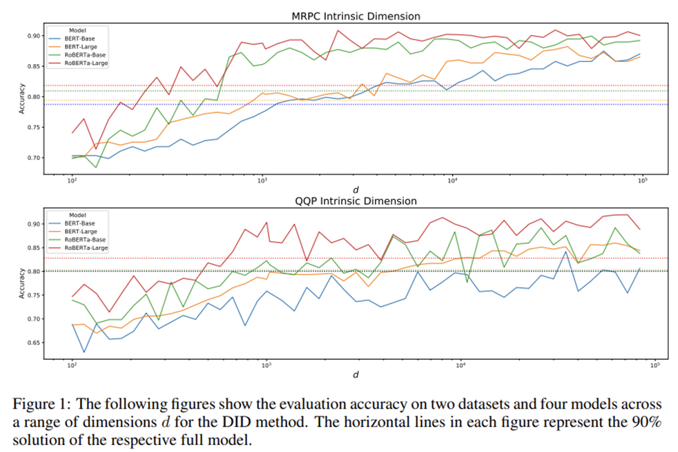 Fig 10은 그 결과를 보여주는데, x축이 차원 d를 나타내고 y축은 accuracy다. MRPC와 QQP 데이터 모두에서 d가 충분히 작아도 그냥 tuning을 하는 것에서 성능 저하가 크지 않음을 볼 수 있다.
