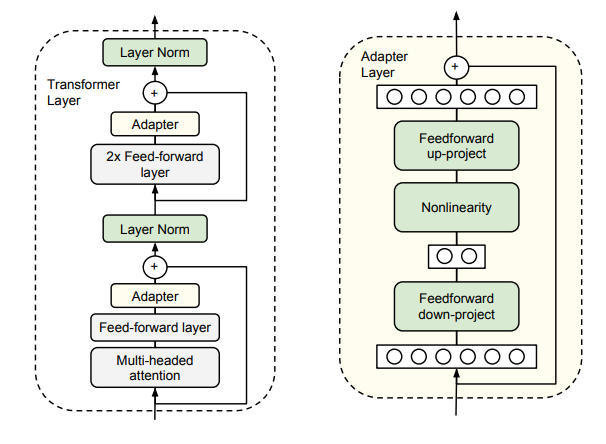 보통 Fig 7과 같은 구조로 feed-forward layer 다음에 넣으며, 원래 모델은 freeze 시킨 후 adapter만 학습시키는 방식이다. 훈련할 파라미터가 훨씬 적어져서 효율적이라는 장점이 있지만 inference latency가 증가하게 되는 단점이 존재한다.