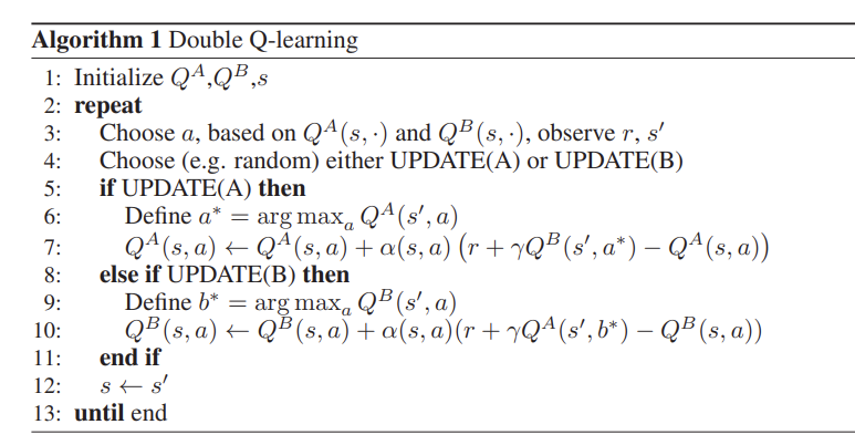 위의 알고리즘을 보면 $Q^{A}$를 업데이트 할 때, a*는 여전히 $Q^{A}$에서 가져오지만 그에 대한 평가는 $Q^{B}$를 사용하여 타깃을 구한다. (이는 DQN에서 봤던 target network를 사용하는 것과 비슷해 보이는데 사실 다르다. target network는 a*와 평가를 모두 $Q^{B}$가 하는 형태이다.)