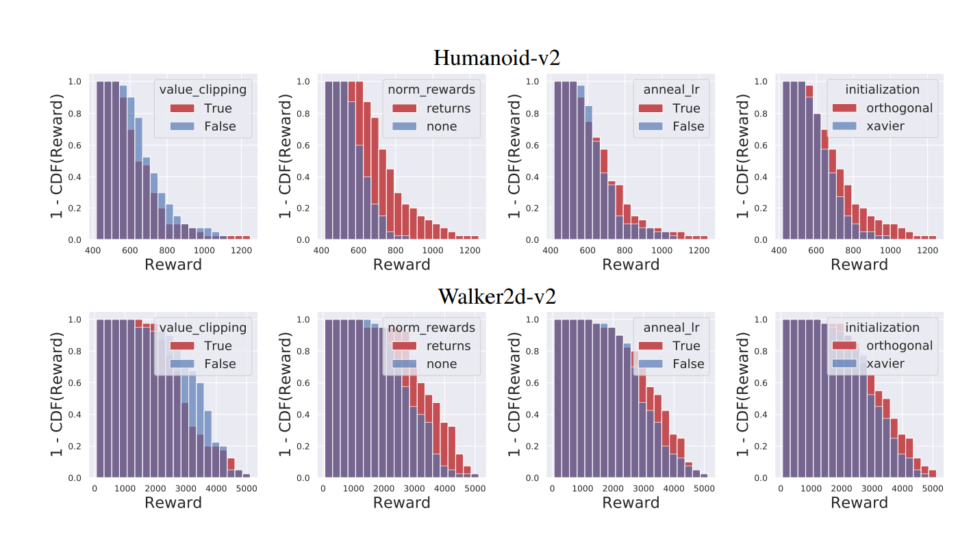 아직까지도 PPO는 많이 사용되는데 위에서 설명한 방법들도 효과가 있겠지만 실제 구현 시 들어간 트릭들이 중요한 역할을 했다고 알려져 있다. 이는 논문 [4]에서 다양한 실험을 통해 그 효과를 보여주고 있다. [4]에서 소개한 PPO의 추가 트릭들은 fig 1과 같은 9개다.