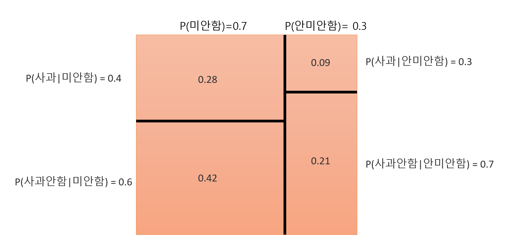 이런 식으로 식만 보고 이해하기는 힘드므로 예시를 들어보는 것이 이해하는데 훨씬 도움이 된다. 내가 누군가와 싸웠는데 그 사람이 먼저 내게 사과를 하였다고 가정해본다. 이때 그 사람은 정말 내게 미안해서 사과를 한 것인가 궁금하다. 이에 대해 확률로 표현해보면 P(미안함|사과)이다. 반대로 사과는 했지만 미안하지 않은 경우는 P(안 미안함|사과)이다.
